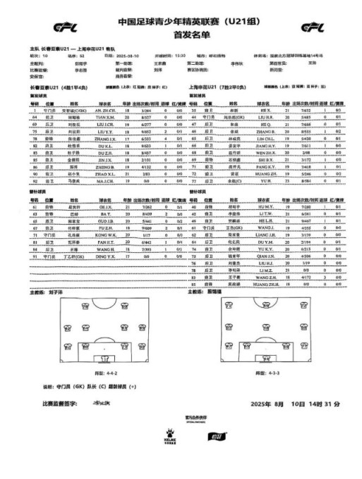 8月10日15:30 ,2025中国足球青少年精英联赛(U21组)重燃战火,第10轮上海申花对阵长春亚泰的比赛在呼和浩特国家北方足球训练基地进行。第63 分钟,王子衡边路传中,黄征禁区内摆渡,庞开元门前抢点得手打入全场唯一入球。最终上海申花1-0获胜。8月12日15:30,申花将继续迎战第11轮对手青岛西海岸。