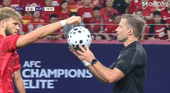 质量不太行啊第14分钟,莱切特向主裁反馈皮球破了需要更换