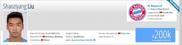 目前身价20万欧元!德转:刘邵子洋自由转会加盟拜仁二队