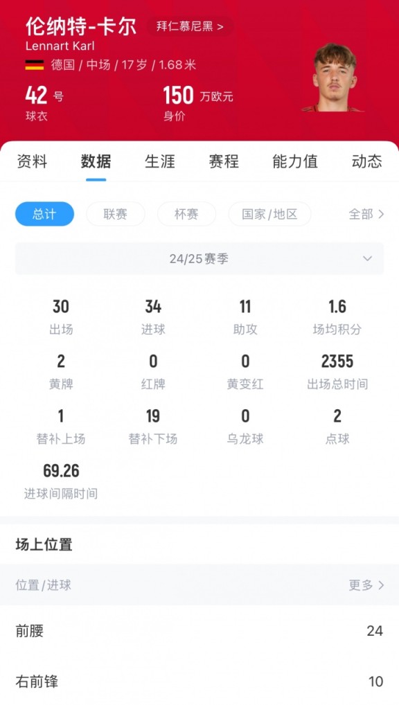 上赛季,他为拜仁青年队共计出场30次,贡献34球11助攻。