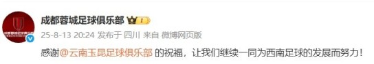 成都蓉城官方转发并回复:感谢云南玉昆足球俱乐部的祝福,让我们继续一同为西南足球的发展而努力!