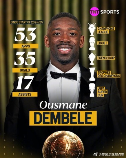 金球奖稳了?登贝莱2024/25赛季表现:53场35球17助攻,五冠王