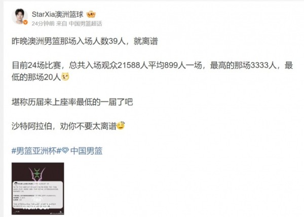 今天,媒体人@StarXia澳洲篮球 在社媒上谈到了这场比赛的上座率:“昨晚澳洲男篮那场入场人数39人,就离谱。
