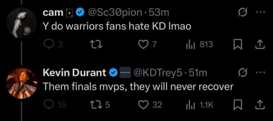 今日,杜兰特在跟网友互动时,一句“那些总决赛MVP,他们(勇士球迷)永远也无法从中恢复过来。”让无数网友抄起键盘。