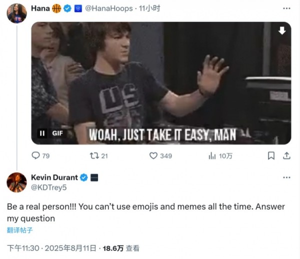 杜兰特回复:“做个真实的人!!!你不能总是用表情包和梗图来回应。回答我的问题。”