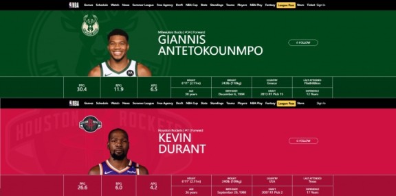 官网数据显示:杜兰特的身高和字母哥一样 体重仅比后者轻不到3斤