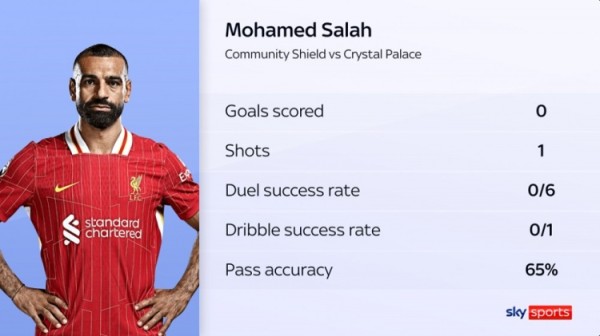 据天空体育统计,萨拉赫本场比赛传球成功率65%,所有非门将首发球员中最低,而且他在一周内第二次罚丢点球。