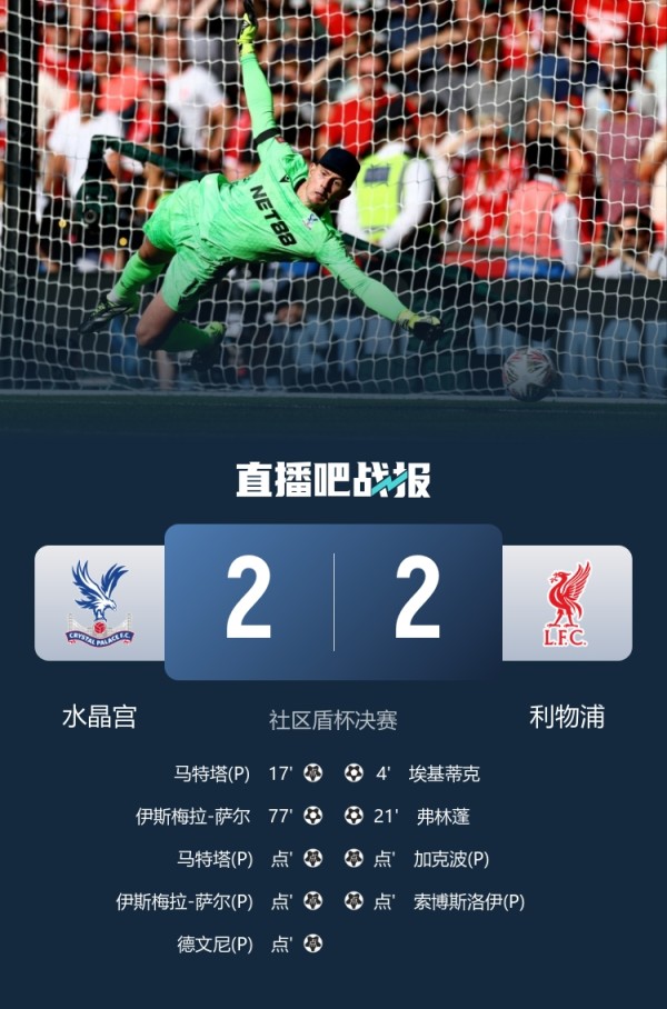 水晶宫点球大战5-4利物浦首夺社区盾!亨德森2扑点萨拉赫麦卡失点