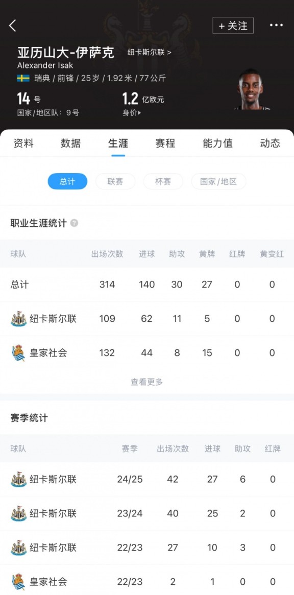 伊萨克现年25岁,德转身价1.2亿欧,2022年夏天以7000万欧转会费加盟纽卡,至今效力3年,一共出场109次,贡献62球11助攻。伊萨克与纽卡的合同还剩3年。