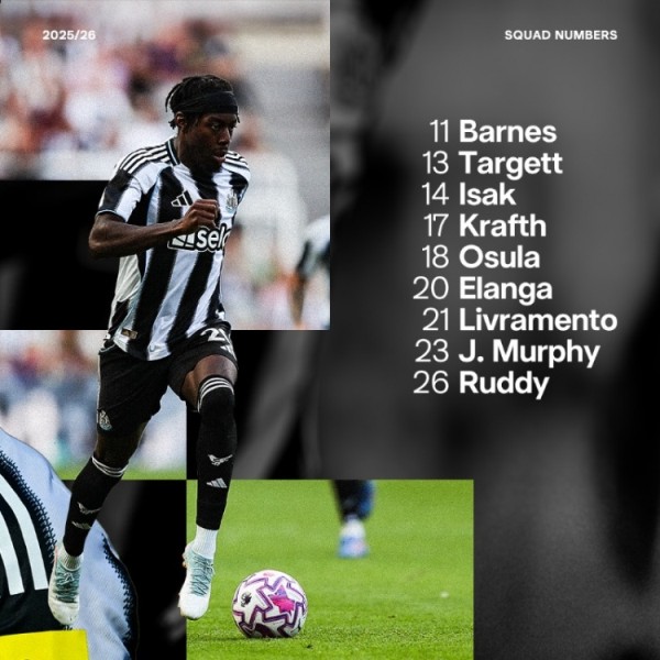 纽卡新赛季球员号码:伊萨克14号,拉姆斯代尔32号,伊兰加20号
