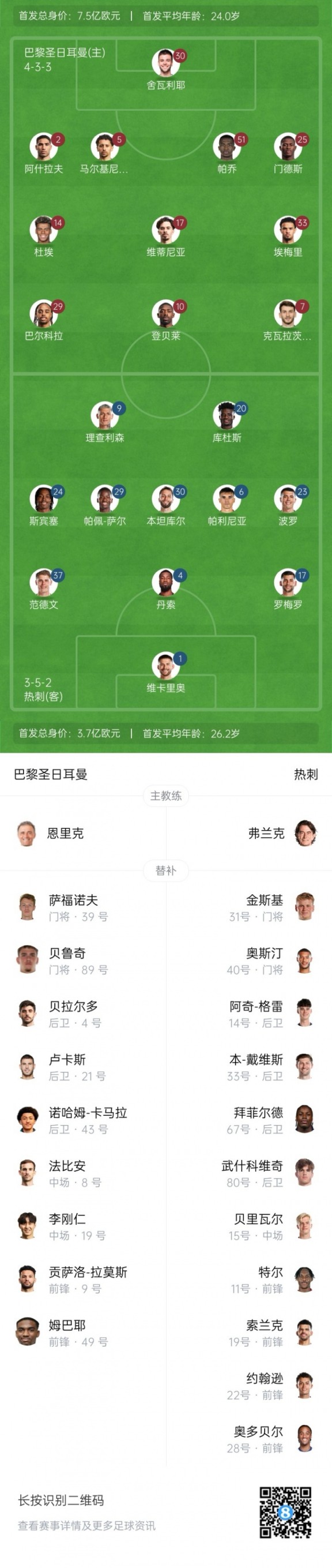 巴黎圣日耳曼首发:30-舍瓦利耶、2-阿什拉夫、5-马尔基尼奥斯、7-克瓦拉茨赫利亚、10-登贝莱、14-杜埃、17-维蒂尼亚、25-努诺-门德斯、29-巴尔科拉、33-扎伊尔-埃梅里、51-帕乔