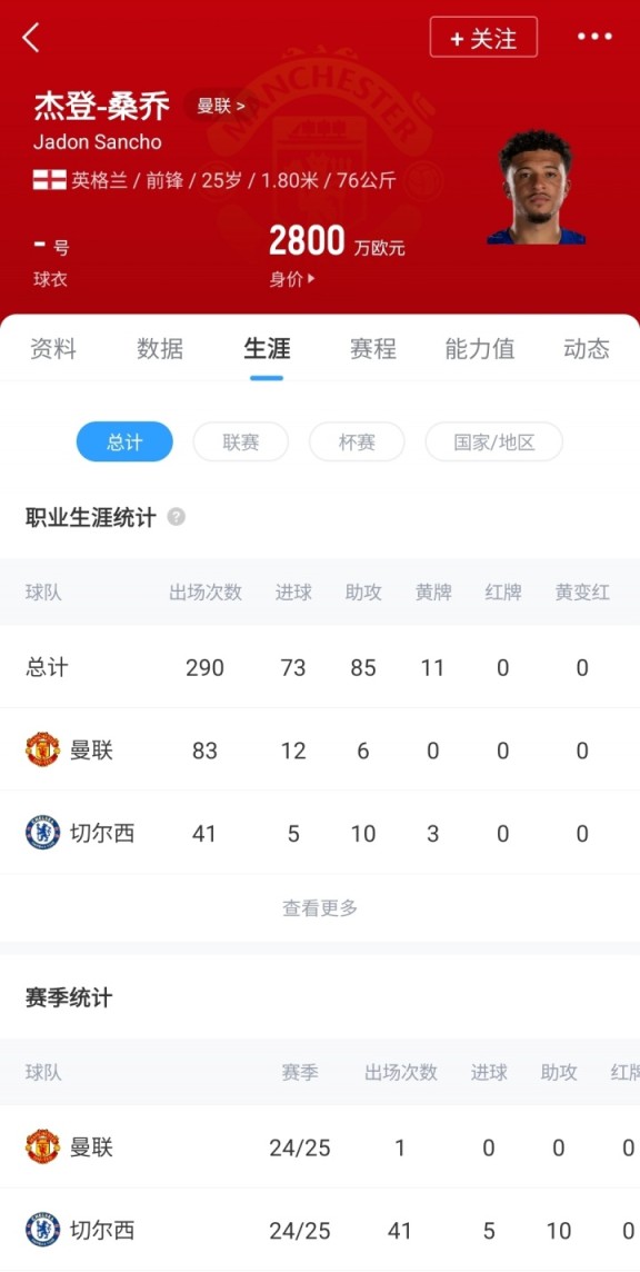 桑乔,现年25岁,上赛季被曼联外租至切尔西,出战41场比赛贡献5球10助,赛季末切尔西支付500万镑违约金将桑乔送回曼联,目前球员德转身价2800万欧。