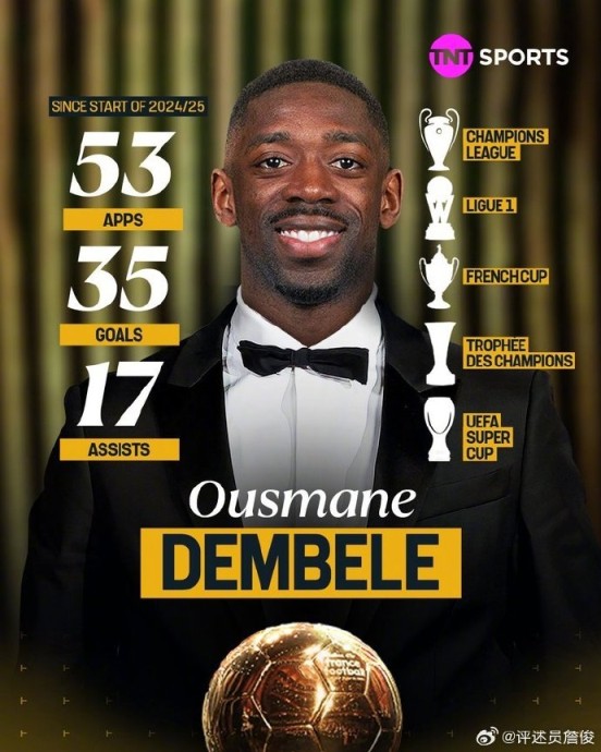 此前金球奖官方公布了金球奖候选人名单,登贝莱凭借上赛季的优秀表现在列;此外他的金球奖赔率也位居候选人第一。
