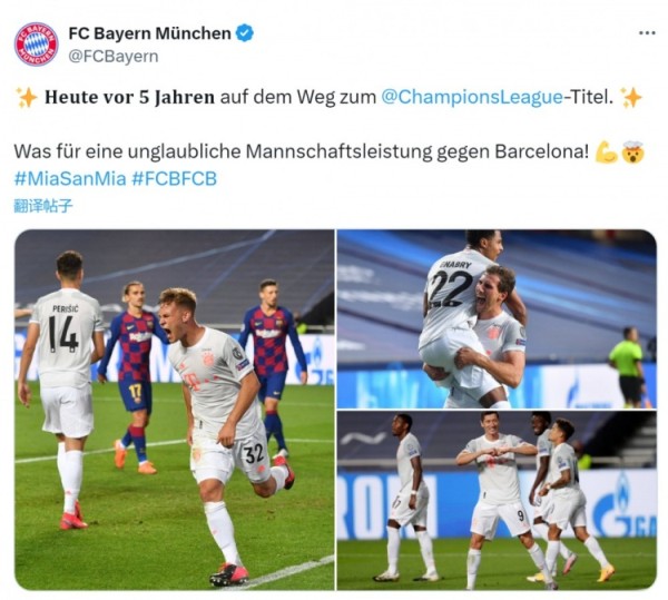 8月14日讯 拜仁官方更新社媒动态,回顾5年前的今天8-2击败巴萨。